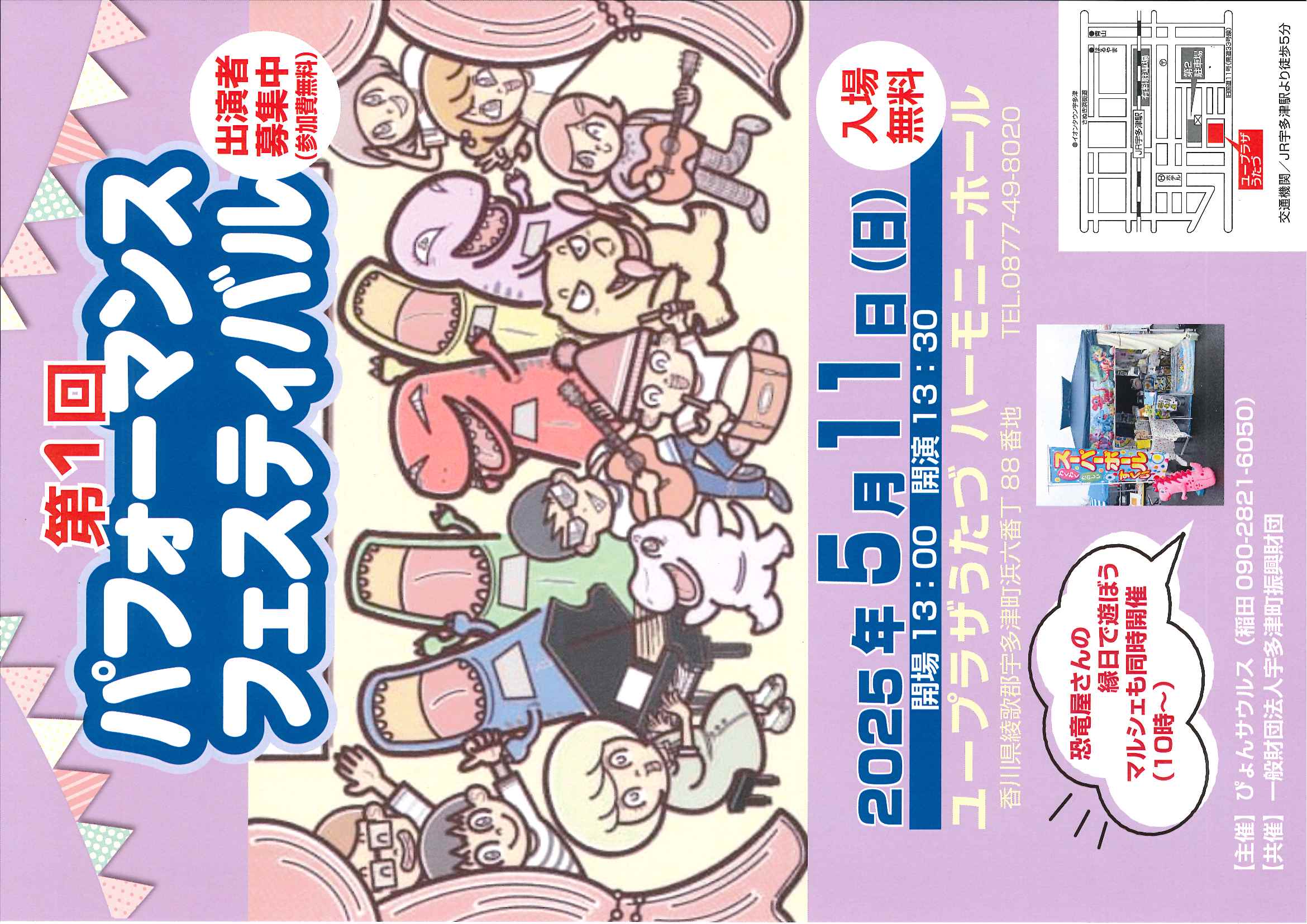 ユープラザうたづで第1回パフォーマンスフェスティバルを開催。ハーモニーホールでは恐竜ダンスをメインにパフォーマンスイベントが盛りだくさん!みんなで盛り上がろう!