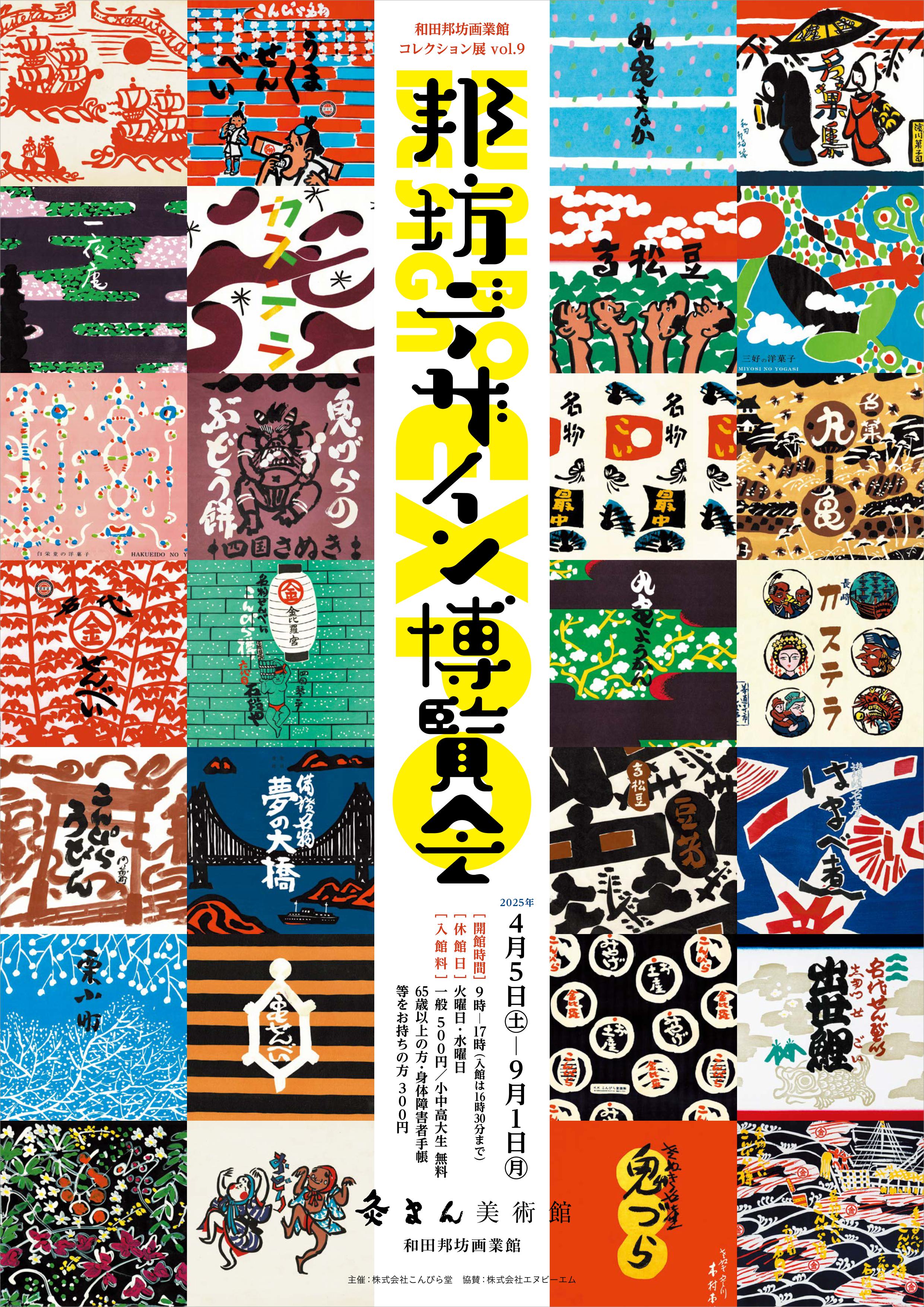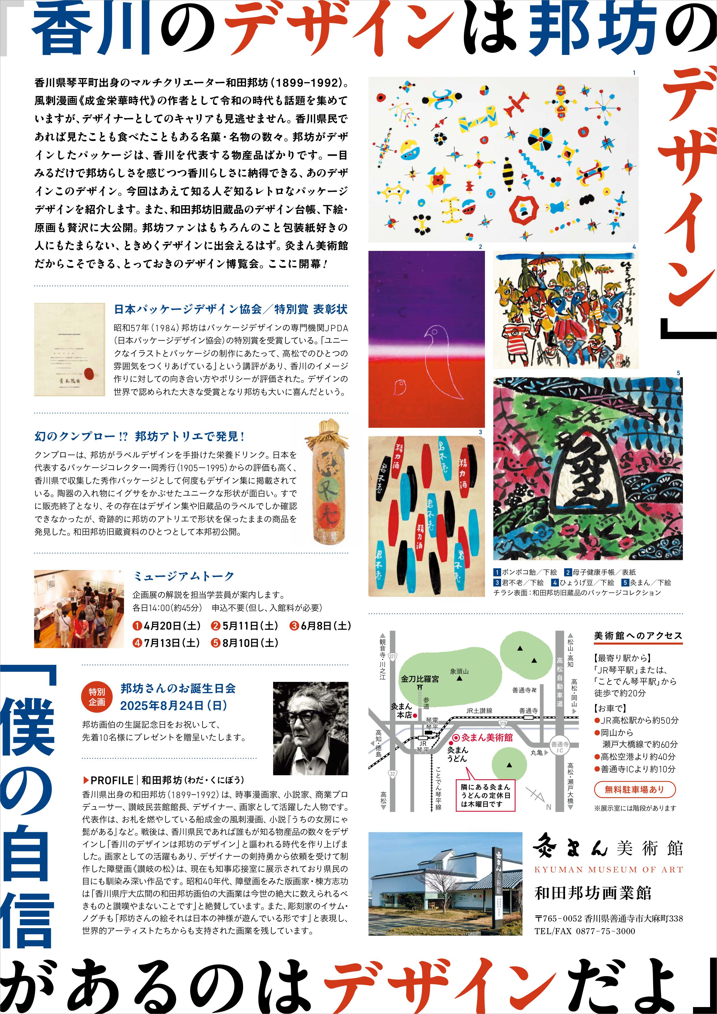 香川県琴平町出身のマルチクリエーター和田邦坊(1899-1992)。風刺漫画《成金栄華時代》の作者として令和の時代も話題を集めていますが、デザイナーとしてのキャリアも見逃せません。香川県民であれば見たことも食べたこともある名菓・名物の数々。邦坊がデザインしたパッケージは、香川を代表する物産品ばかりです。一目みるだけで邦坊らしさを感じつつ香川らしさに納得できる、あのデザインこのデザイン。今回はあえて知る人ぞ知るレトロなパッケージデザインを紹介します。また、和田邦坊旧蔵品のデザイン台帳、下絵・原画も贅沢に大公開。邦坊ファンはもちろんのこと包装紙好きの人にもたまらない、ときめくデザインに出会えるはず。灸まん美術館だからこそできる、とっておきのデザイン博覧会!ここに開幕!