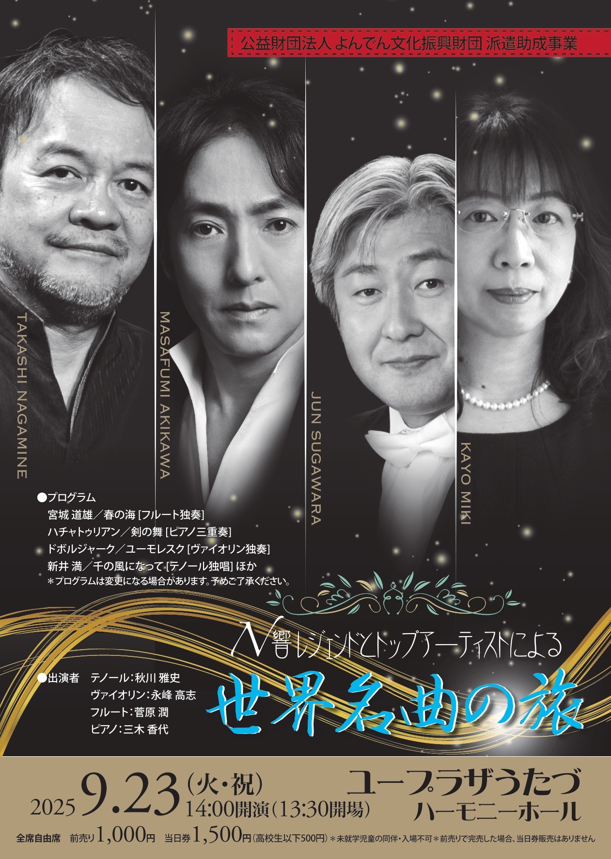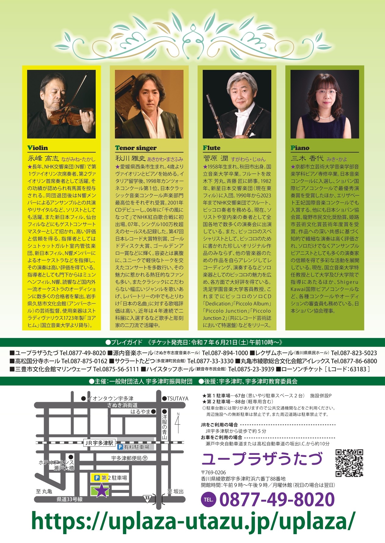 ヴァイオリン:永峰高志、テノール:秋川雅文、フルート:菅原潤、ピアノ:三木香代によるクラッシックコンサートを開催します。プログラムは「千の風になって」「春の海」など。
