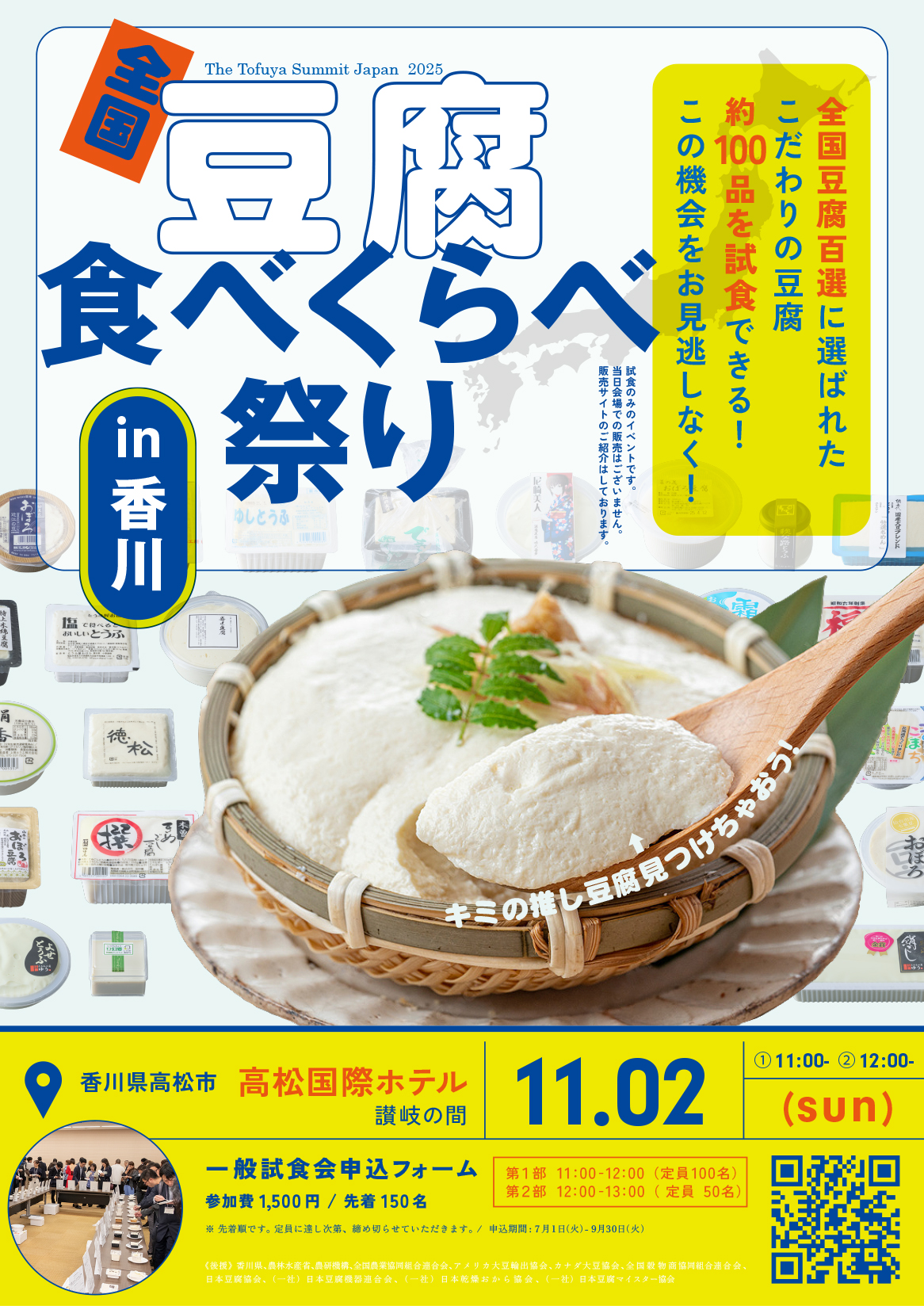 全国から予選を勝ち抜いた、選りすぐりの 約100品以上の豆腐 が一堂に集結。来場者は香川県・高松市にて、日本各地の技と味わいを存分に堪能できます。豆腐好きはもちろん、グルメ愛好家にとっても これほどの規模で豆腐を味わえる機会は極めて稀 です。                                                                                                                  ■イベントの見どころ