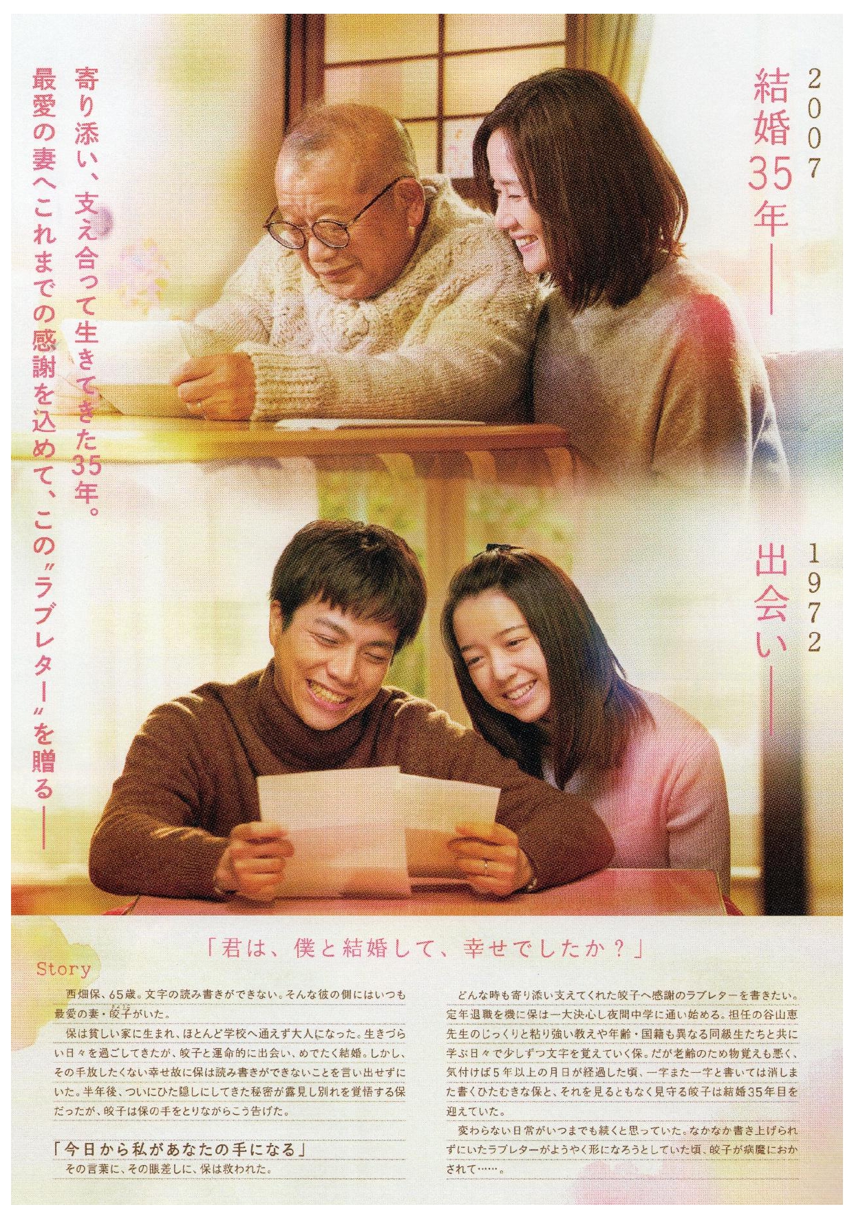 西畑保、65歳。文字の読み書きができない。そんな彼のそばにはいつも最愛の妻・皎子がいた。どんな時も寄り添い支えてくれた皎子に感謝のラブレターを書きたい。定年退職を機に夜間中学に通い始める。同級生たちと共に学ぶ日々で少しずつ文字を覚えていく保。老齢の為に物覚えも悪く気づけば5年以上の月日が経過していた。書いてはまた消し書くひたむきな保と見ることもなく見守る皎子は結婚35年目を迎えていた。ようやくラブレターが形になろうとしていた頃、皎子が病魔におかされて…。